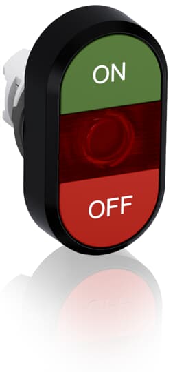 Modular Double Pushbutton – Momentary – Flush/Flush – Green/Red Actuator, Red Indicator – Illuminated – No contact block – Lower Button: OFF – Upper Button: ON